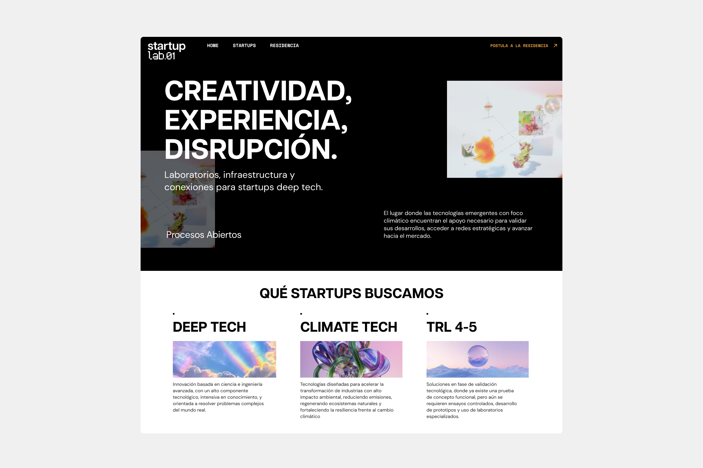 Hoy, Startuplab.01 habita un entorno digital que actúa como un soporte firme para el talento científico. La nueva plataforma no solo organiza la complejidad de su oferta, sino que asegura que su propuesta de valor sea evidente desde el primer contacto, consolidando una experiencia de marca profesional y coherente que potencia la aceleración de soluciones científico-tecnológicas.